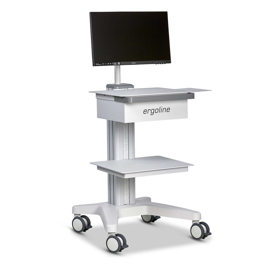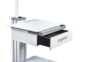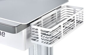 Der kompakte Tastaturauszug mit ausziehbarem Mauspad, kann an beliebiger Stelle an der Tragsäule unter einem Ablageboden montiert werden. Beim mobilen Einsatz des Gerätewagens kann eine Standard-Tastatur bequem unter den Ablageboden geschoben werden.