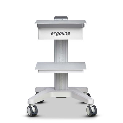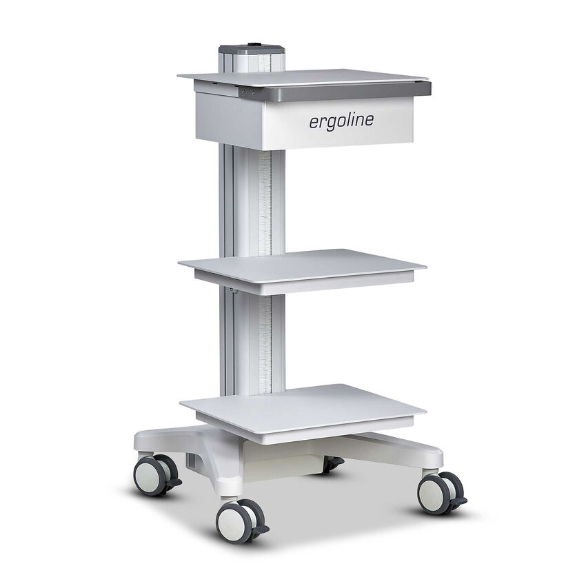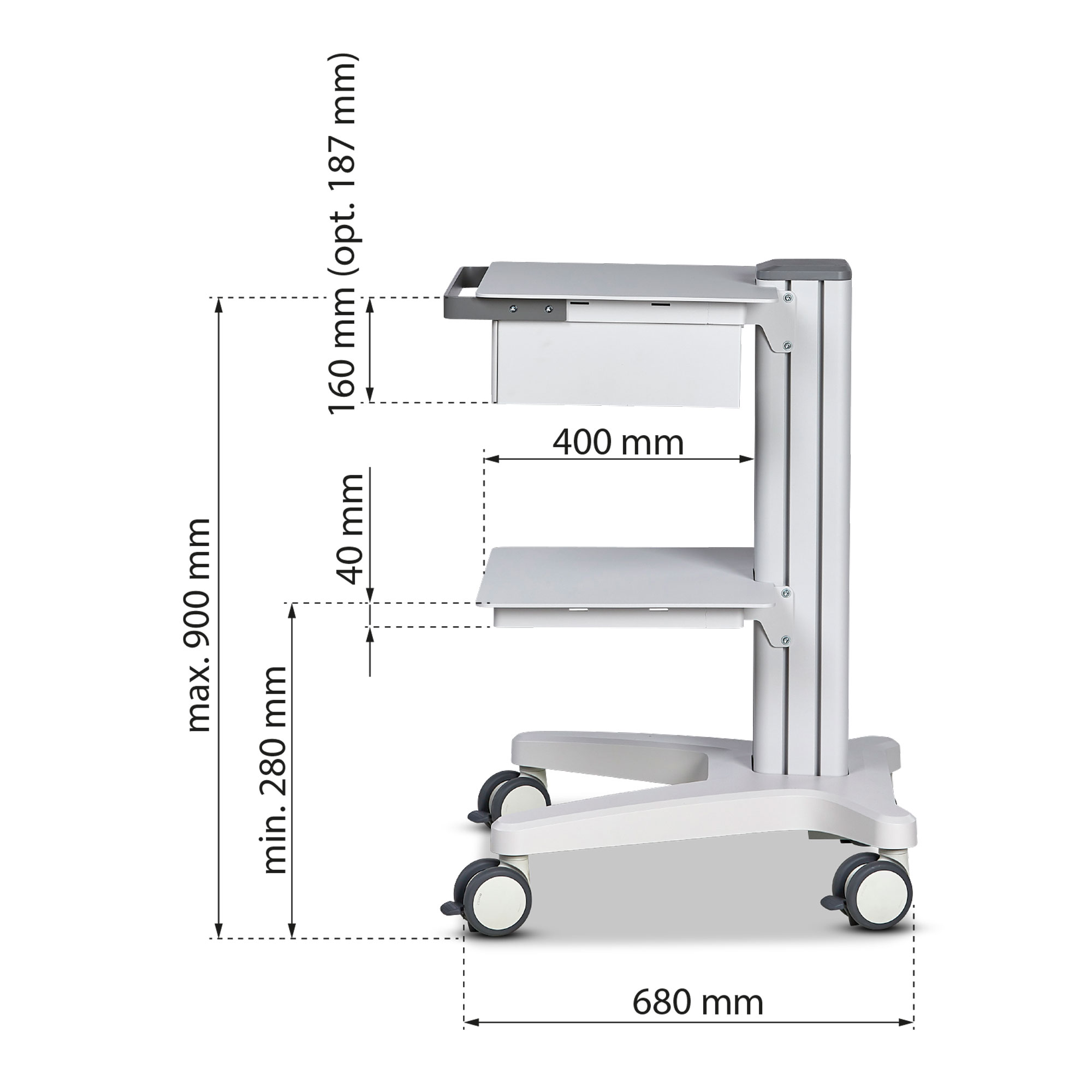 Alle Ablageböden werden aus Aluminium gefertigt und anschließend pulverbeschichtet und sind bis zu 20 kg belastbar (Flächenlast). Die Breite der Böden ist so bemessen, dass auch eine Standardtastatur problemlos platziert werden kann. Komfortable Griffe zum leichten Verschieben des Gerätewagens sind in verschiedenen Ausführungen und Farben erhältlich.