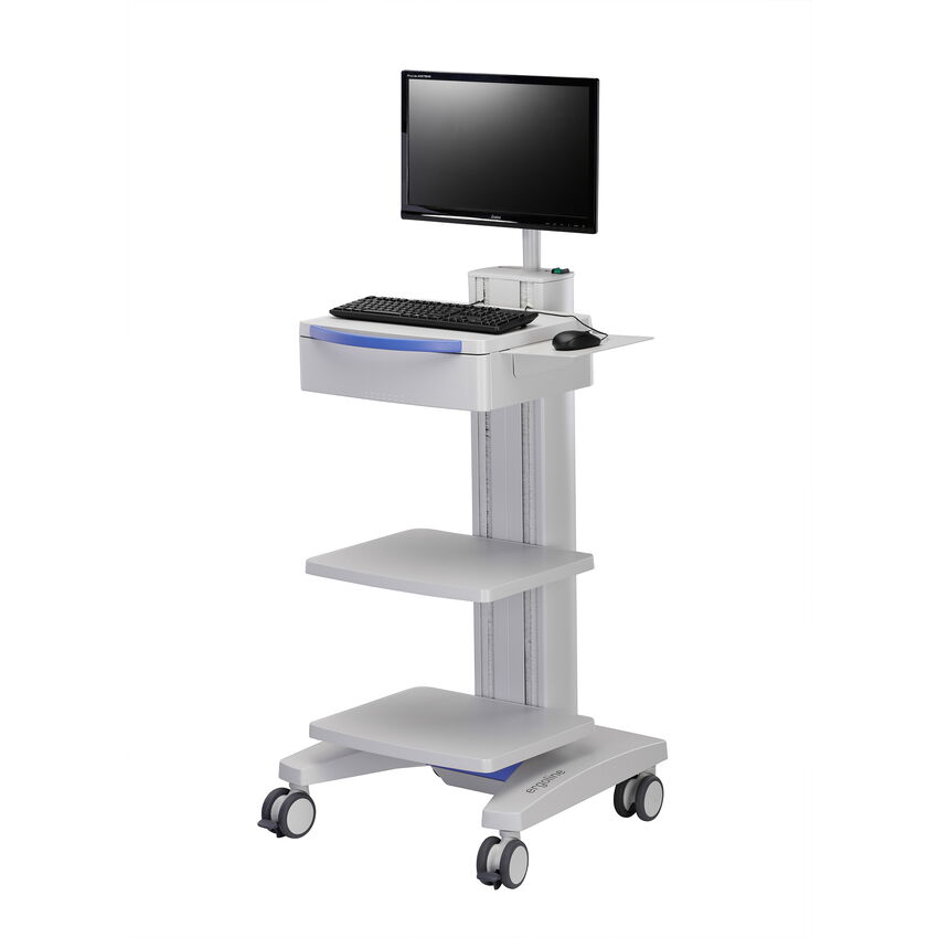 The compact keyboard tray is mounted below the top shelf. If the equipment cart is in mobile use, a standard keyboard can easily slide under the shelf. The mouse pad, also designed as a pull-out, can be mounted on the right or left side.