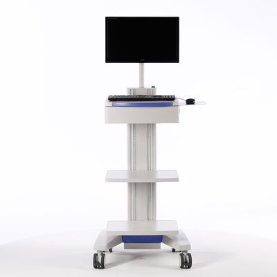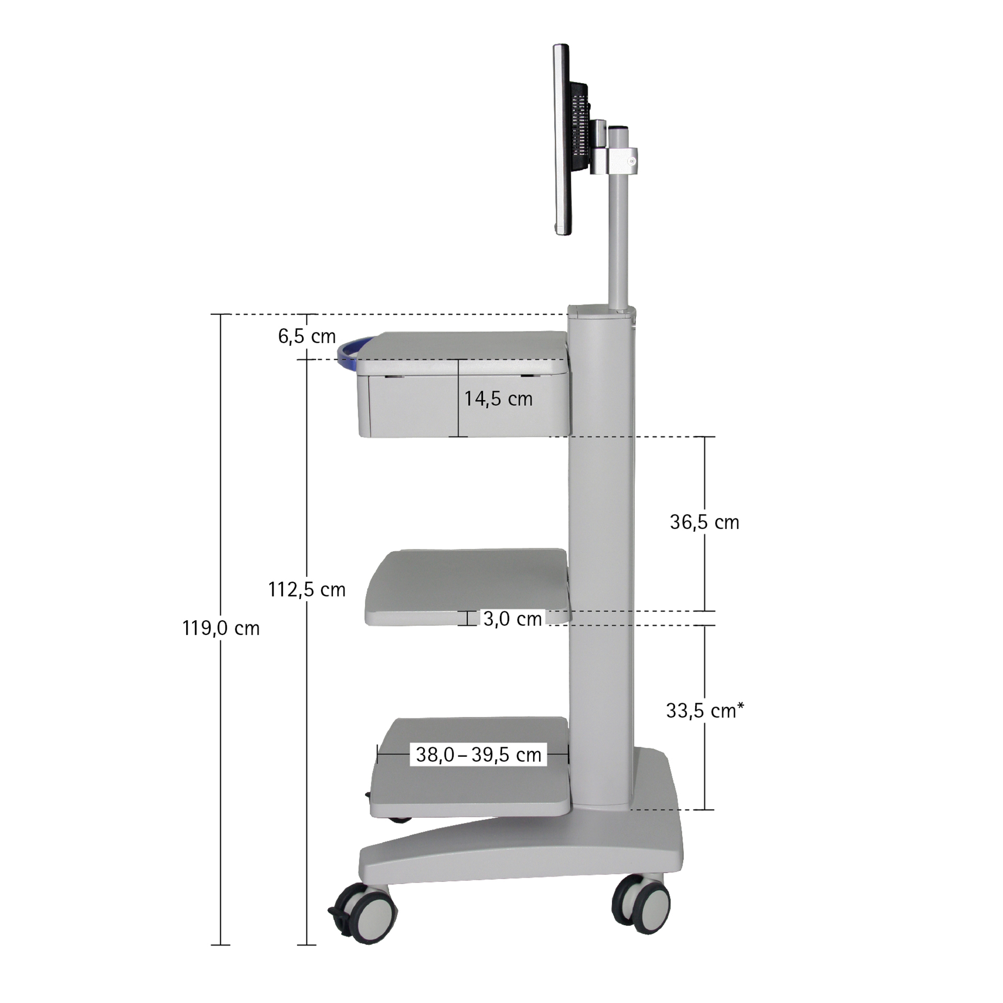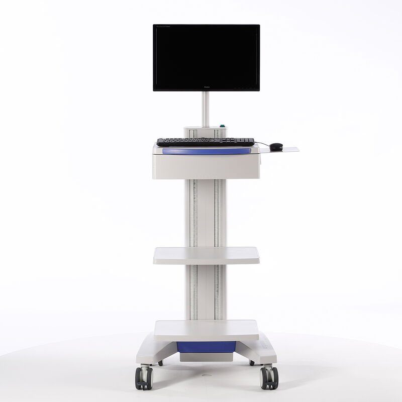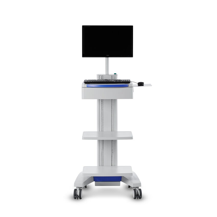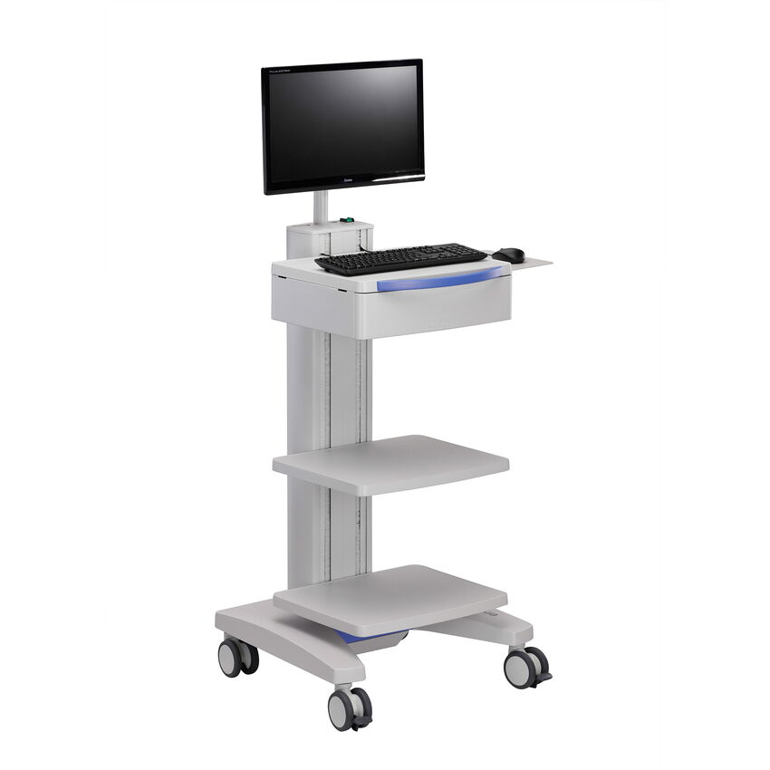 All shelves are elaborately manufactured of cast aluminum with a powder coating and can support loads of up to 20 kg (surface load). The shelf width is designed to easily accommodate a standard keyboard. Convenient grip handles for easy moving of the equipment cart are available in various designs and colors.