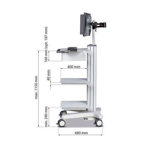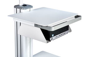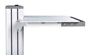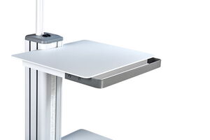 Der kompakte Tastaturauszug mit ausziehbarem Mauspad, kann an beliebiger Stelle an der Tragsäule unter einem Ablageboden montiert werden. Beim mobilen Einsatz des Gerätewagens kann eine Standard-Tastatur bequem unter den Ablageboden geschoben werden.