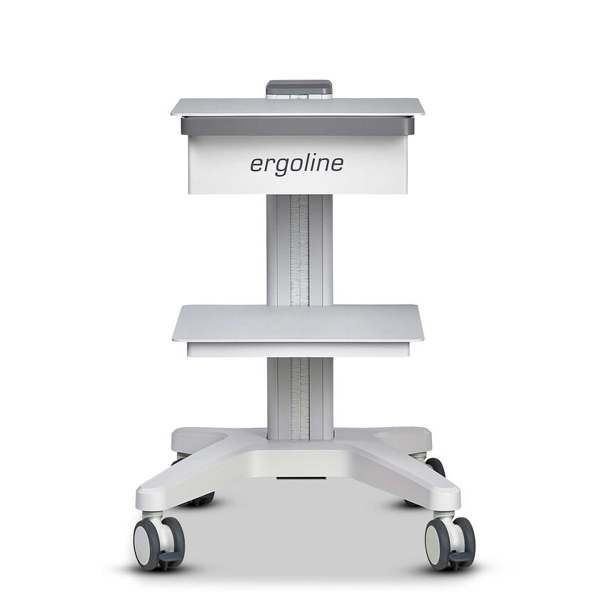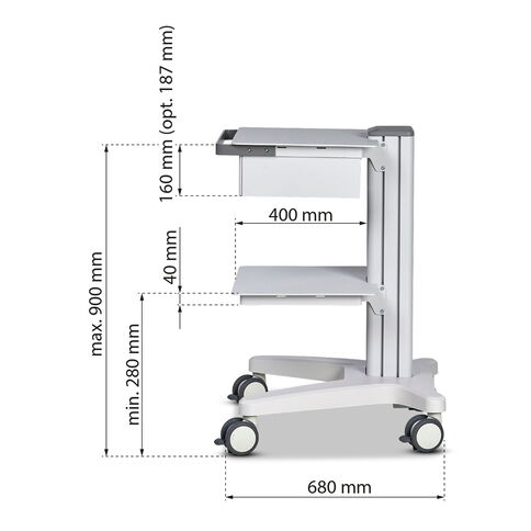 Alle Ablageböden werden aus Aluminium gefertigt und anschließend pulverbeschichtet und sind bis zu 20 kg belastbar (Flächenlast). Die Breite der Böden ist so bemessen, dass auch eine Standardtastatur problemlos platziert werden kann. Komfortable Griffe zum leichten Verschieben des Gerätewagens sind in verschiedenen Ausführungen und Farben erhältlich.
