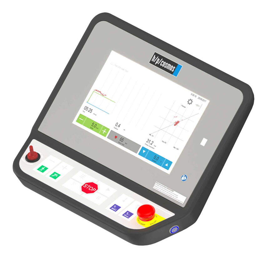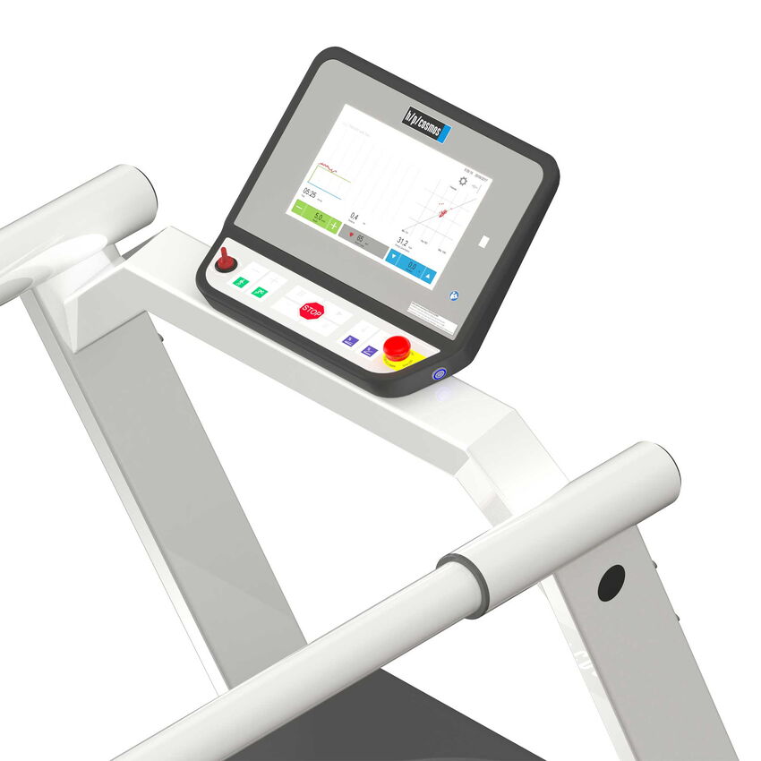 Das ergosprint T mit Bedienterminal ermöglicht die Darstellung aller wichtigen Informationen auf einem einzigen Display. Das LC-Display zeichnet sich durch seine hervorragende Ablesbarkeit aus. Die intuitive Bedienung ermöglicht neben der Steuerungsmöglichkeit über PC-EKG oder EKG-Schreiber auch die Verwendung von kundenspezifischen ergometrischen Testprotokollen wie Bruce, Naughton, Ellestad, Gardner, Conconi, Rampe, etc. Manuelle Geschwindigkeits- und Neigungseinstellungen sind ebenfalls möglich.